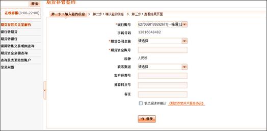 3)输入签约信息:选择签约的银行卡号、期货公司名称、输入期货公司资金帐号、阅读电子协议(以上为必填项)