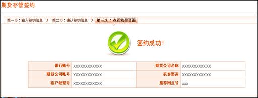 5)查看结果页面:平安银行实时将签约信息发送给期货公司校验,如果成功,则显示成功结果界面。如果不成功,将显示失败界面。